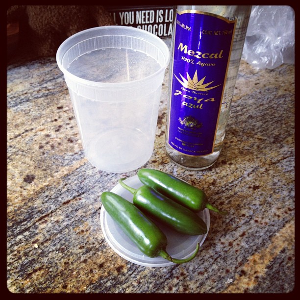 I personally LOVE Mezcal. A lot of my friends have been unfamiliar with Mezcal and how it differentiates from Tequila. Both are distilled from the Agave plant but prepared differently. Tequila is made from steaming the agave whereas Mezcal chars the Agave giving in the smoky almost scotch like quality. I love the smoke that you get from a good Mezcal and think it pairs very well with spice so decided to try a Jalapeño infused Mezcal. Later put to use in a Spicy Mezcal Mule.